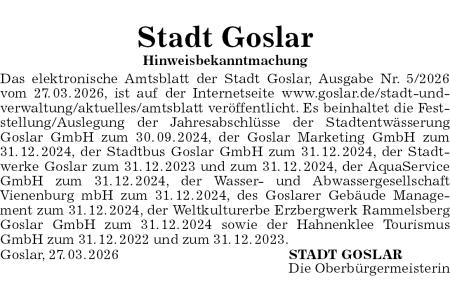 Stadt Goslar Hinweisbekanntmachung Das elektronische Amtsblatt der Stadt Goslar, Ausgabe Nr. 5/2026 vom 27.03.2026, ist auf der Internetseite www.goslar.de/stadt-und-verwaltung/aktuelles/amtsblatt veröffentlicht. Es beinhaltet die Feststellung/Auslegung der Jahresabschlüsse der Stadtentwässerung Goslar GmbH zum 30.09.2024, der Goslar Marketing GmbH zum 31.12.2024, der Stadtbus Goslar GmbH zum 31.12.2024, der Stadtwerke Goslar zum 31.12.2023 und zum 31.12.2024, der AquaService GmbH zum 31.12.2024, der Wasser- und AbwassergesellschaftVienenburg mbH zum 31.12.2024, des Goslarer Gebäude Management zum 31.12.2024, der Weltkulturerbe Erzbergwerk Rammelsberg Goslar GmbH zum 31.12.2024 sowie der Hahnenklee Tourismus GmbH zum 31.12.2022 und zum 31.12.2023. Goslar, 27.03.2026STADT GOSLAR Die Oberbürgermeisterin