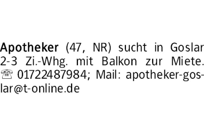 Apotheker (47, NR) sucht in Goslar 2-3 Zi.-Whg. mit Balkon zur Miete. 01722487984; Mail: apotheker-goslar@t-online.de