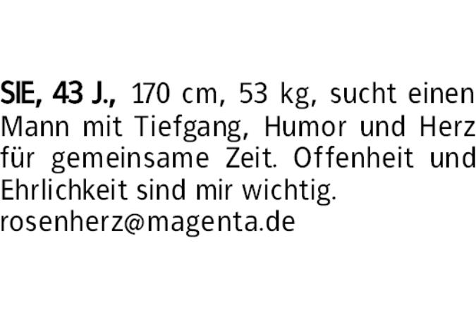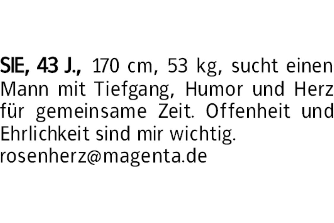 SIE, 43 J., 170 cm, 53 kg, sucht einen Mann mit Tiefgang, Humor und Herz für gemeinsame Zeit. Offenheit und Ehrlichkeit sind mir wichtig.rosenherz@magenta.de