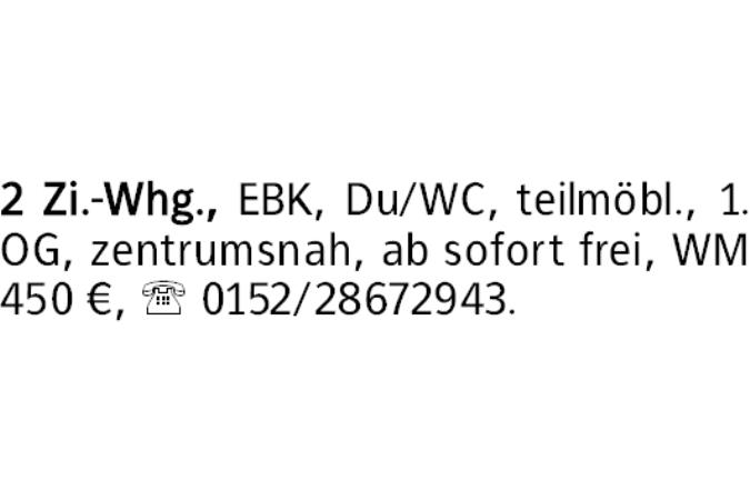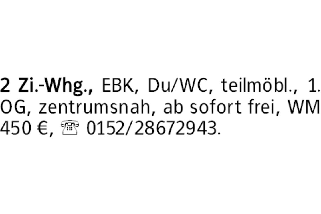 2 Zi.-Whg., EBK, Du/WC, teilmöbl., 1. OG, zentrumsnah, ab sofort frei, WM 450 €, 0152/28672943.