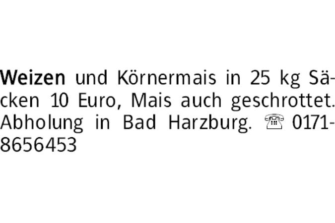 Weizen und Körnermais in 25 kg Säcken 10 Euro, Mais auch geschrottet. Abholung in Bad Harzburg. 0171-8656453