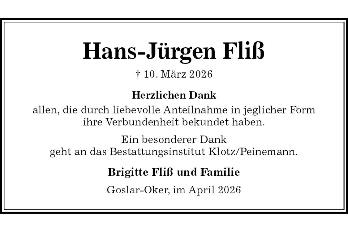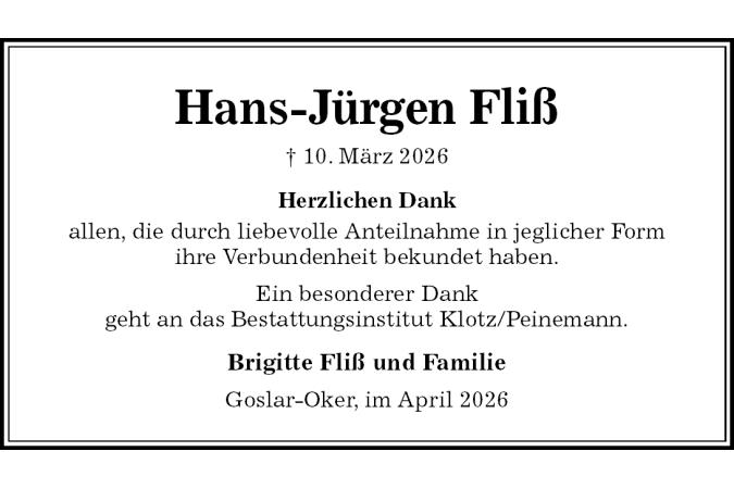 Hans-Jürgen Fliß † 10. März 2026 Brigitte Fliß und Familie Goslar-Oker, im April 2026 Herzlichen Dankallen, die durch liebevolle Anteilnahme in jeglicher Formihre Verbundenheit bekundet haben.Ein besonderer Dankgeht an das Bestattungsinstitut Klotz/Peinemann.