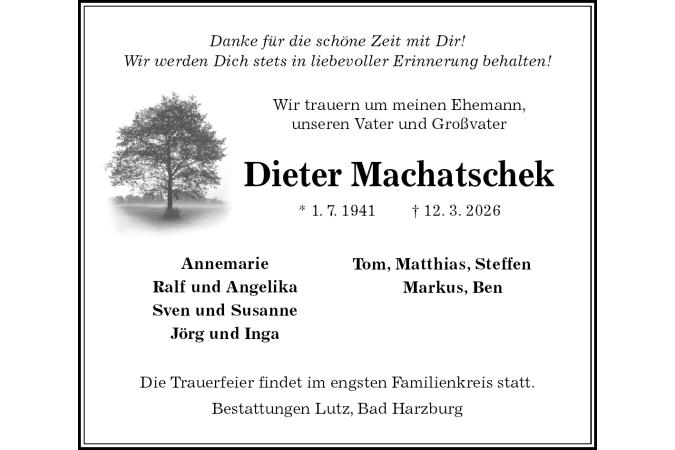 Danke für die schöne Zeit mit Dir! Wir werden Dich stets in liebevoller Erinnerung behalten! Wir trauern um meinen Ehemann,unseren Vater und Großvater Dieter Machatschek * 1. 7. 1941† 12. 3. 2026 Annemarie Ralf und Angelika Sven und SusanneJörg und IngaDie Trauerfeier findet im engsten Familienkreis statt.Bestattungen Lutz, Bad Harzburg Tom, Matthias, Steffen Markus, Ben