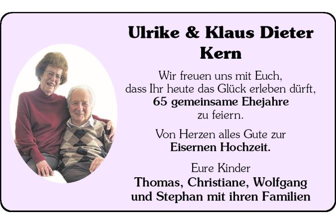 Wir freuen uns mit Euch,dass Ihr heute das Glück erleben dürft, 65 gemeinsame Ehejahrezu feiern.Ulrike & Klaus Dieter Kern Eure KinderThomas, Christiane, Wolfgangund Stephan mit ihren Familien Von Herzen alles Gute zurEisernen Hochzeit.