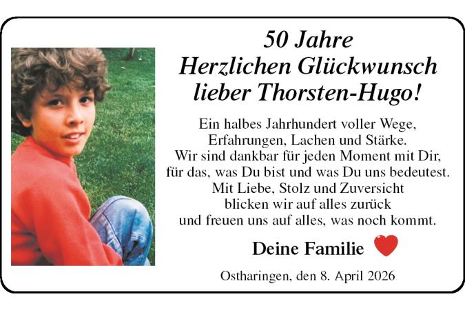 50 Jahre Herzlichen Glückwunsch lieber Thorsten-Hugo! Deine Familie Ostharingen, den 8. April 2026 Ein halbes Jahrhundert voller Wege, Erfahrungen, Lachen und Stärke. Wir sind dankbar für jeden Moment mit Dir, für das, was Du bist und was Du uns bedeutest. Mit Liebe, Stolz und Zuversicht blicken wir auf alles zurück und freuen uns auf alles, was noch kommt.