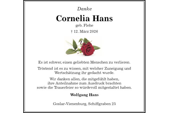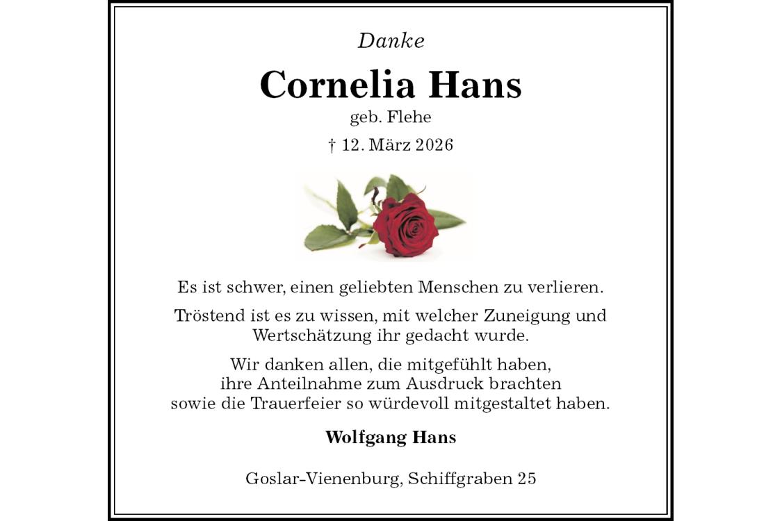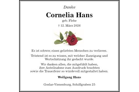 Cornelia Hans geb. Flehe † 12. März 2026 Wolfgang Hans Goslar-Vienenburg, Schiffgraben 25 DankeEs ist schwer, einen geliebten Menschen zu verlieren.Tröstend ist es zu wissen, mit welcher Zuneigung und Wertschätzung ihr gedacht wurde.Wir danken allen, die mitgefühlt haben,ihre Anteilnahme zum Ausdruck brachtensowie die Trauerfeier so würdevoll mitgestaltet haben.