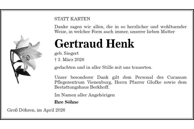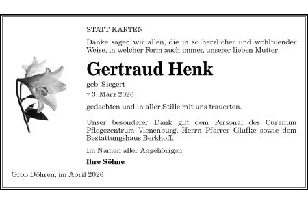 STATT KARTEN Gertraud Henk† 3. März 2026Im Namen aller Angehörigen Ihre SöhneGroß Döhren, im April 2026gedachten und in aller Stille mit uns trauerten.Unser besonderer Dank gilt dem Personal des Curanum Pflegezentrum Vienenburg, Herrn Pfarrer Glufke sowie dem Bestattungshaus Berkhoff. geb. SiegertDanke sagen wir allen, die in so herzlicher und wohltuender Weise, in welcher Form auch immer, unserer lieben Mutter