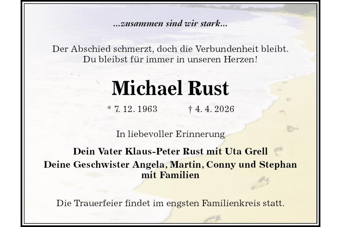 ...zusammen sind wir stark... Der Abschied schmerzt, doch die Verbundenheit bleibt.Du bleibst für immer in unseren Herzen! Michael Rust * 7. 12. 1963† 4. 4. 2026In liebevoller Erinnerung Dein Vater Klaus-Peter Rust mit Uta Grell Deine Geschwister Angela, Martin, Conny und Stephan mit Familien Die Trauerfeier findet im engsten Familienkreis statt.