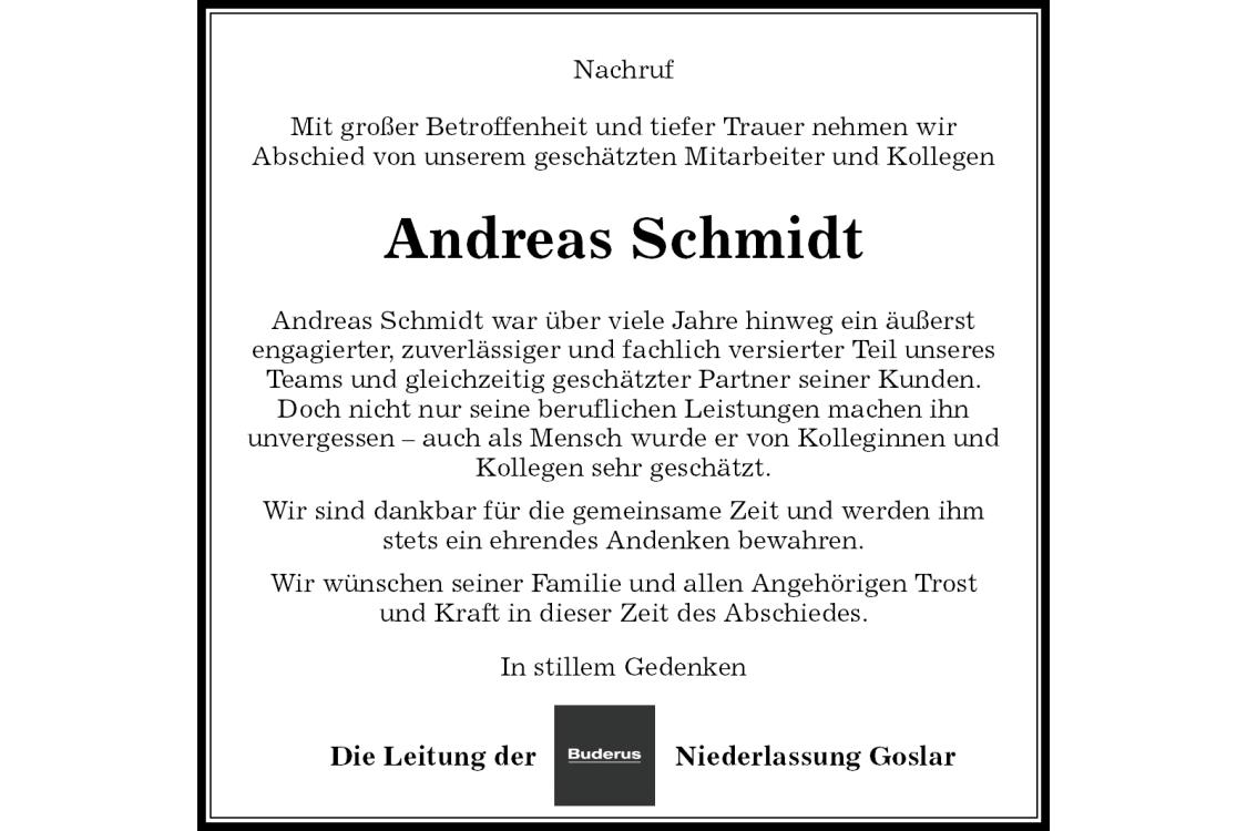 Nachruf Mit großer Betroffenheit und tiefer Trauer nehmen wir Abschied von unserem geschätzten Mitarbeiter und Kollegen Andreas Schmidt Die Leitung der Niederlassung Goslar Andreas Schmidt war über viele Jahre hinweg ein äußerst engagierter, zuverlässiger und fachlich versierter Teil unseres Teams und gleichzeitig geschätzter Partner seiner Kunden. Doch nicht nur seine beruflichen Leistungen machen ihn unvergessen – auch als Mensch wurde er von Kolleginnen und Kollegen sehr geschätzt.Wir sind dankbar für die gemeinsame Zeit und werden ihm stets ein ehrendes Andenken bewahren.Wir wünschen seiner Familie und allen Angehörigen Trost und Kraft in dieser Zeit des Abschiedes. In stillem Gedenken
